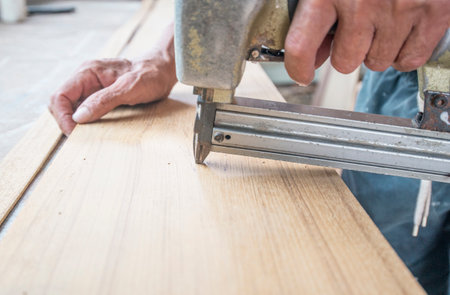Carpenter using an industrial construction stapler on a wood plank.