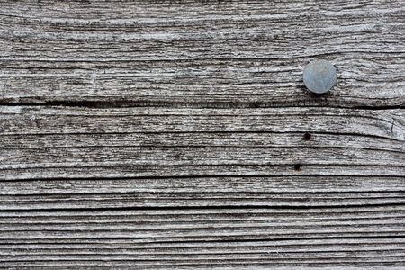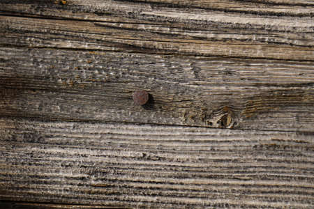 Background and closeup and structure of a weathered gray wooden plank with a nail stuck in it
