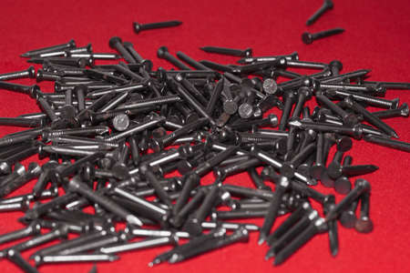 Black steel nails on red background, randomly scattered