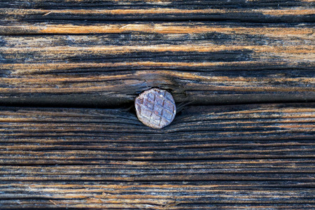 A macro shot of the metal nail in the old aged and weathered wooden bench