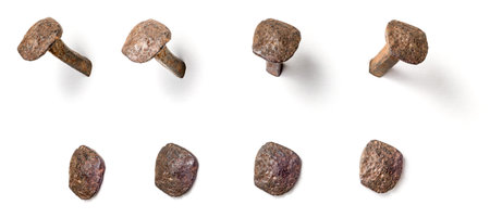 A hand-forged nail from different perspectives on a white background