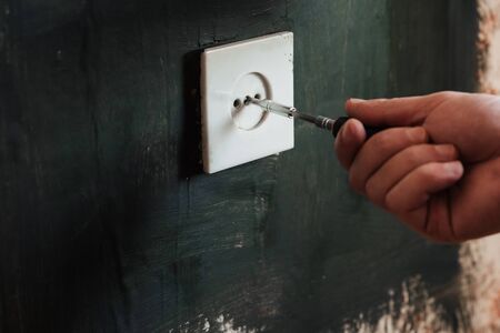 male electrician changes an old electrical outlet by unscrewing the screw with a screwdriver