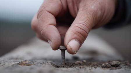 A detailed close-up image captures a hand gently placing a nail into a wooden surface. The soft focus of the background enhances the focus on the nail and fingers, showcasing craftsmanship and attention to detail.