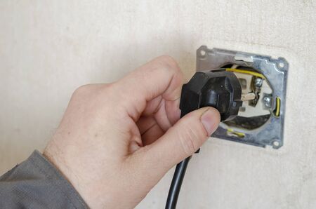 An electrician checks a disassembled outlet. The hand of a man in protective work clothes brings the electric plug to the disassembled outlet. Danger of electric shock. Selective focus.