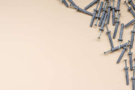 Plastic anchor and bolts on background, construction tool.