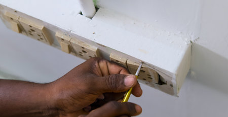 Experienced electrician checking socket with mains tester screwdriver