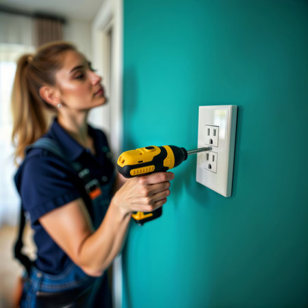 Electrician woman. A focused female electrician uses a drill to install an electrical outlet indoors.