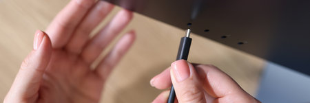 Person hand connects a black USB-C or Type C power cable to computer