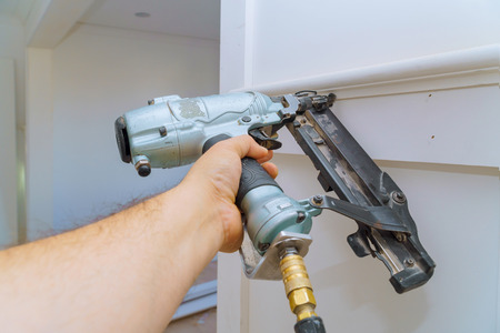 Installation of mouldings on the wall of the fragment of molding, top view of carpenter brad using nail gun