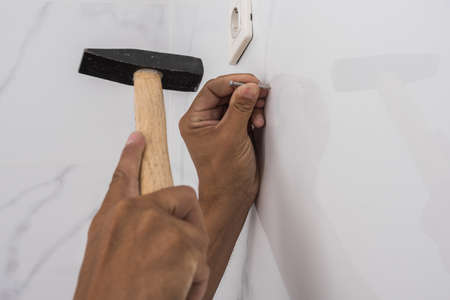 close up of hands hammering nail to wall at home