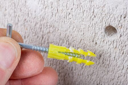 Hole in the wall, screw and dowel for fixing in concrete. Wall mounting methods. Light background.