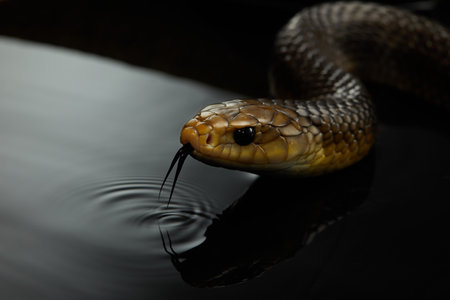Close-up of a black snake on a black background with reflection