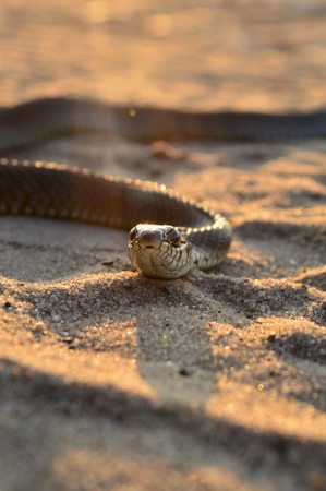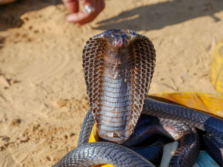 Close up of the head of a cobra snake in the desert