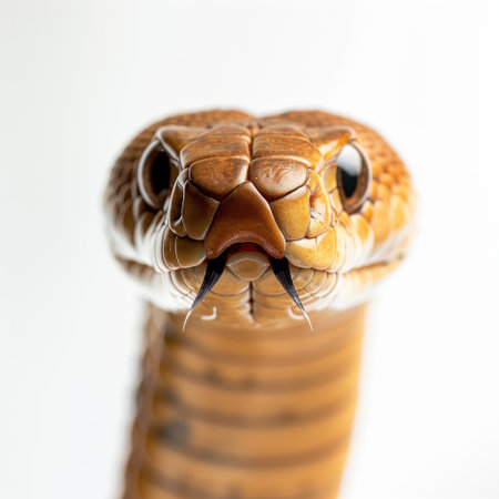 A close-up shot of a cobras head as it prepares to strike, with a focus on its intricate scales and piercing gaze.