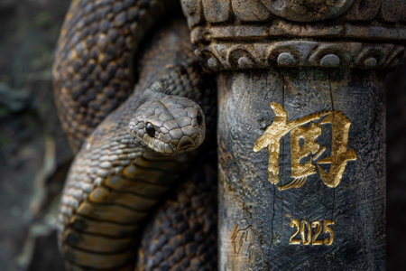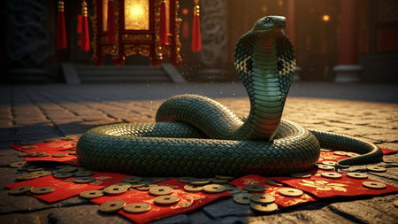 Cobra snake, an auspicious symbol, coiled on a stone ground, surrounded by red envelopes and golden coins in a traditional setting.