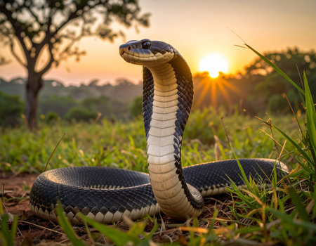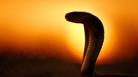 A striking silhouette of a cobra against a vibrant sunset, showcasing the elegance of this reptile while blending beautifully with the warm colors of the sky.
