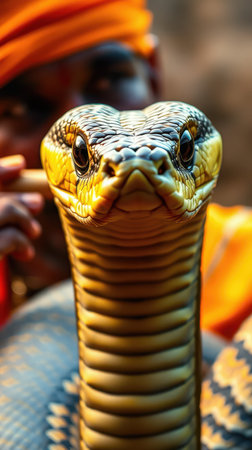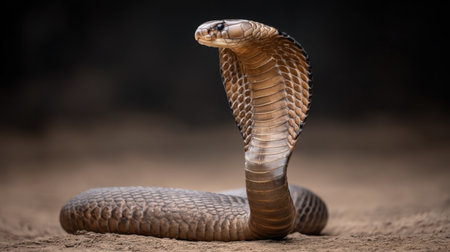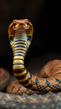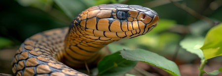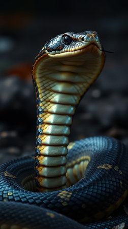A stunning close-up of a majestic cobra with its hood raised, showcasing detailed scales. This captivating snake is poised in its natural habitat, exuding grace and danger.