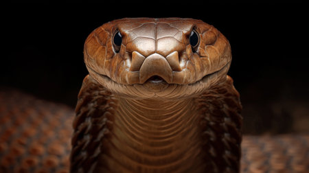This close-up view captures the head of a brown snake, showcasing its detailed scales and piercing eyes. The dramatic dark background enhances the intricate patterns and highlights the fierce beauty of this reptile in its natural habitat.