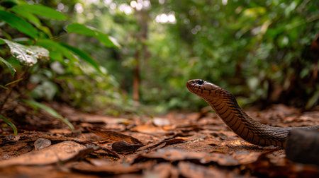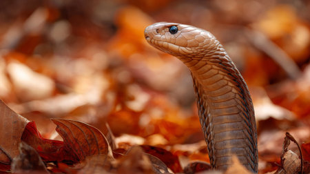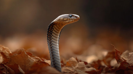 Majestic King Cobra Poised in Striking Position Amongst Autumn Leaves in Forest Setting AI Generative