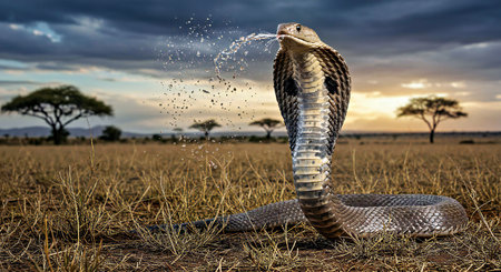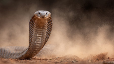 This image captures a close-up view of a cobra hissing in a cloud of dust. The fierce expression and detailed scales highlight the danger and beauty of this iconic snake in its natural habitat.