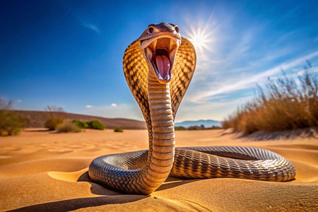 Desert Cobra Attack Pose, Sunny Day, Sand Dunes, Wildlife