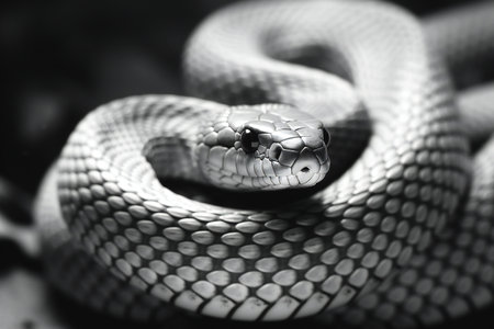 Close-up view of a snake highlighting its intricate scale patterns and striking features in a natural setting
