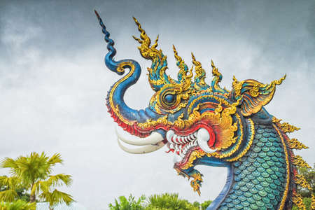 Chiang Rai, Thailand - July 12, 2017: Naga Head Statue Inside Wat Rong Sua Ten Or Blue Temple At Rain Clouds Background.