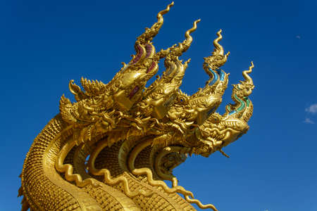 The golden great naga statue with white cloud and blue sky backgroud at Wat Phra Thart Doi Wao, Chiengrai, Thailand