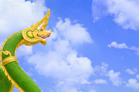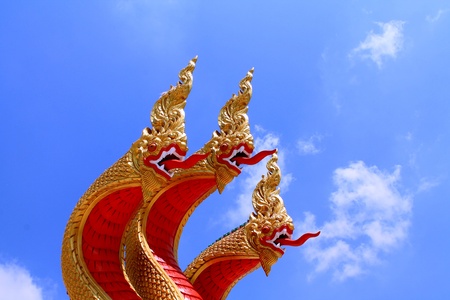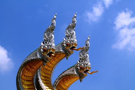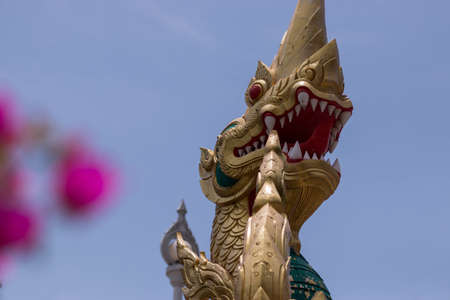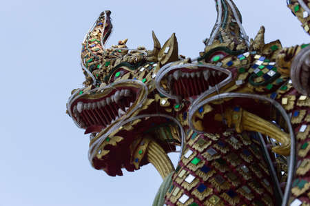The naga head guarding The temple in Bangkok Thailand, blue sky background