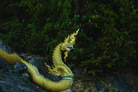 Golden Naga serpent statue in lush green forest, traditional Thai Buddhist mythology sculpture in natural setting.