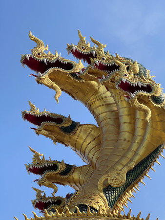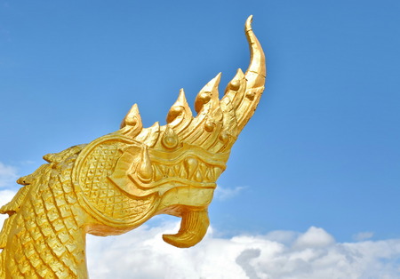 NAKHON PHANOM THAILAND : The golden serpent head or king of naga statue on blue sky background is located on the banks of Mekong River in Thailand.