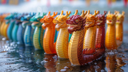 cultural festival traditions, dragon boat paddles are neatly arranged on the shore, getting ready for the dragon boat festival race amidst a festive setting