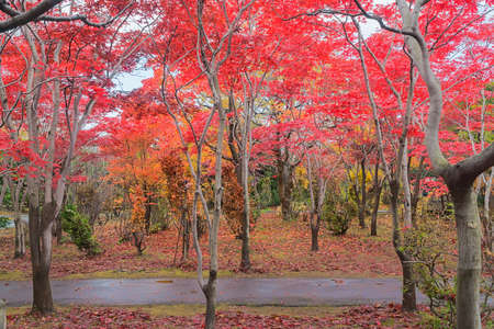 Gunma, Japan - Nov 8, 2019. Path through the autumn forest in Kusatsu Onsen Town, Japan.