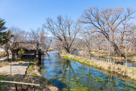 Snow covered the ground with leafless trees and tourists in winter at the area of Fukidashi Park in Hokkaido, Japan.