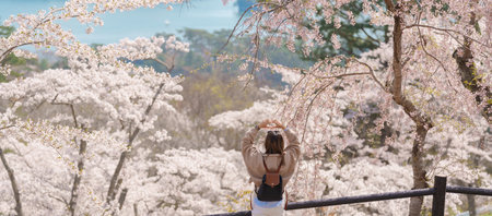 Woman tourist sightseeing Iwate mountain and Kitakami river with flowers in Spring, happy traveler travel in Morioka city, Iwate prefecture, Japan. famous Landmark Travel and Vacation destination