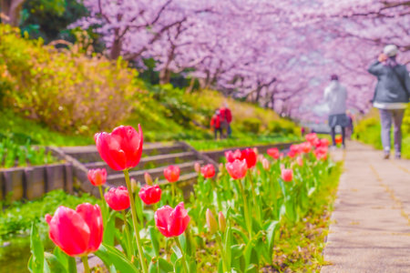 Beautiful cherry blossom 'sakura' and tulip in spring time
