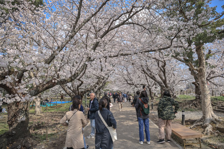 Cherry blossom at riverbank park of Shiroishi River in Miyagi, Japan. Hanami (cherry blossom) is a cultural symbol of Japan, one of the events to attract tourists.