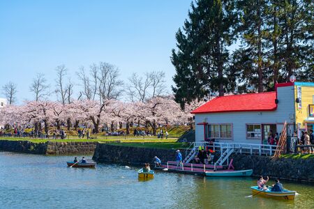 Beautiful Hirosaki Castle park with Sakura Cherry Blossom in Spring, traveling in Hirosaki city, Aomori, Tohoku, Japan. Landmark famous in Japan. Travel and Vacation destination