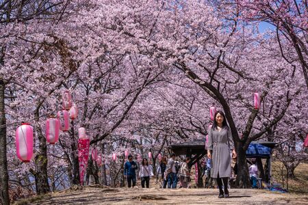 Nagano, Japan - April 20, 2019 : Unidentified people visit Kobo mountain cherry blossom full bloom in Matsumoto of Nagano Japan.