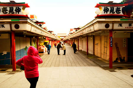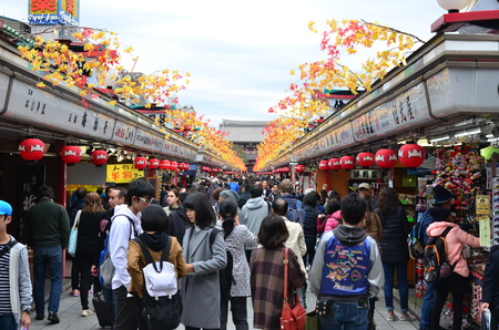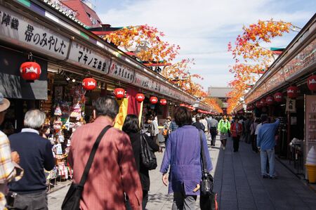 ASAKUSA, JAPAN - Oct 29, 2016: Nakamise Shopping Street Asakusa on Oct 29 in Tokyo, Japan. It is lined by more than 50 shops, which offers local specialties and tourist souvenirs.