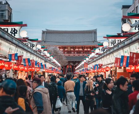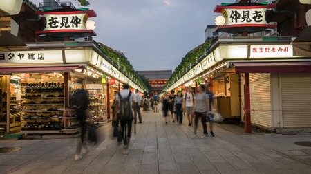 Tokyo, Japan - August 2018: Unidentified people at Asakusa Sensoji Kannon Temple Market in the evening