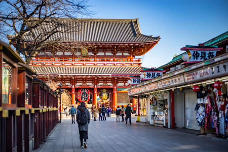 TOKYO, JAPAN - Jan 09 2020 Many people visit Nakamise-dori shopping street at Senso-ji Temple in Tokyo, Japan. Senso-ji is an ancient Buddhist temple located in Asakusa, Tokyo, Japan.