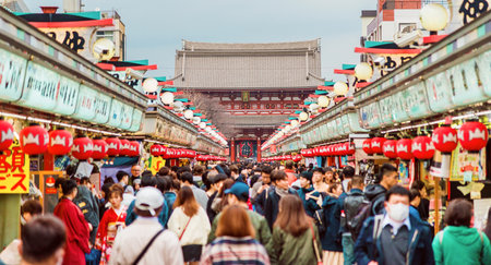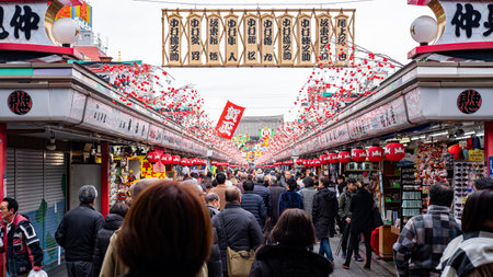 TOKYO, JAPAN - JANUARY 15, 2019: Tokyo Hot Spot, Tourists on Nakamise shopping street to Sensoji Temple, Asakusa Kannon Temple.