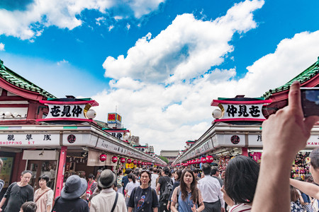 TOKYO, JAPAN - June 22, 2018 : Sensoji temple at Asakusa neighborhood, tourists are very happy to pay homage to blessing. This area has many shops & shopping center. One of Tokyo's must-see places to visit