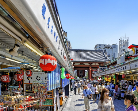 Tokyo, Japan - May 16, 2017: Many tourists and local people are walking along shops and store at Sensoji Temple, Tokyo, Japan