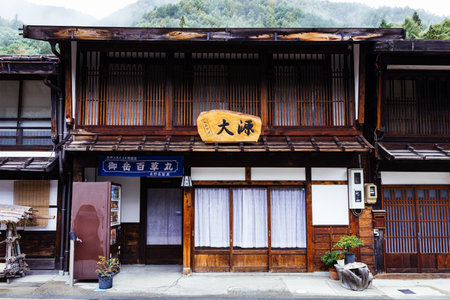 Nagano, Japan - April 20, 2019 : View of shop in Narai Post town (Narai-Juku) Japan Old wooden house and narrow street in Kiso Valley of Nagano Japan.