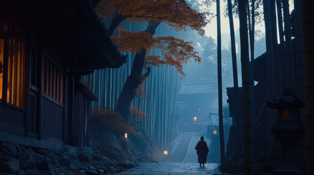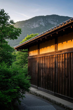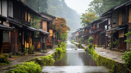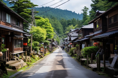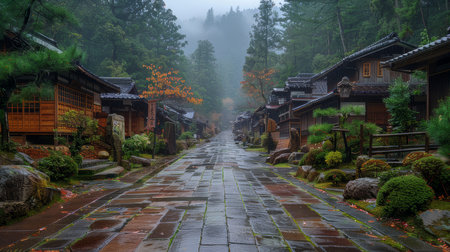 Atmospheric pathway through a traditional Japanese village nestled in a lush forest, evoking serenity, peace, and cultural heritage. Ideal for nature admiration and travel inspiration.