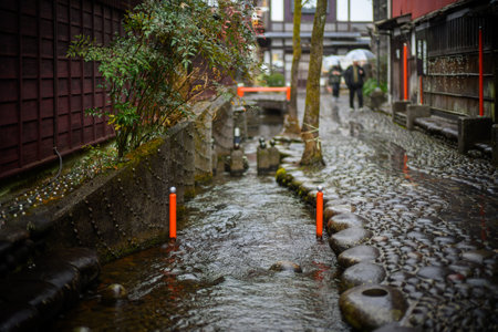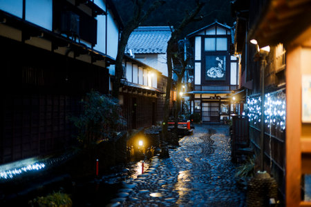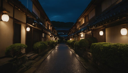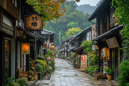 Charming street with traditional Japanese wooden architecture, featuring glowing lanterns and lush greenery, on a tranquil rainy day