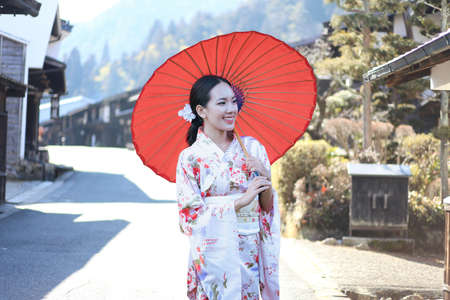 Asian woman tourists. Beautiful girl wearing traditional japanese kimono in Tsumago juku is now popular in village at Nagano Prefecture, Japan.