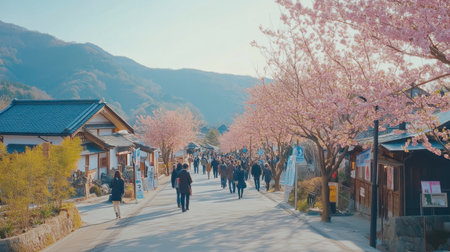 Springtime brings vibrant cherry blossoms to a serene Japanese village nestled in the mountains, enhancing the tranquil landscape at dawn.